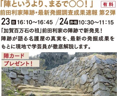 | プログラム | 「陣というより、まるで○○!」前田利家陣跡・最新発掘調査成果速報 第2弾 |